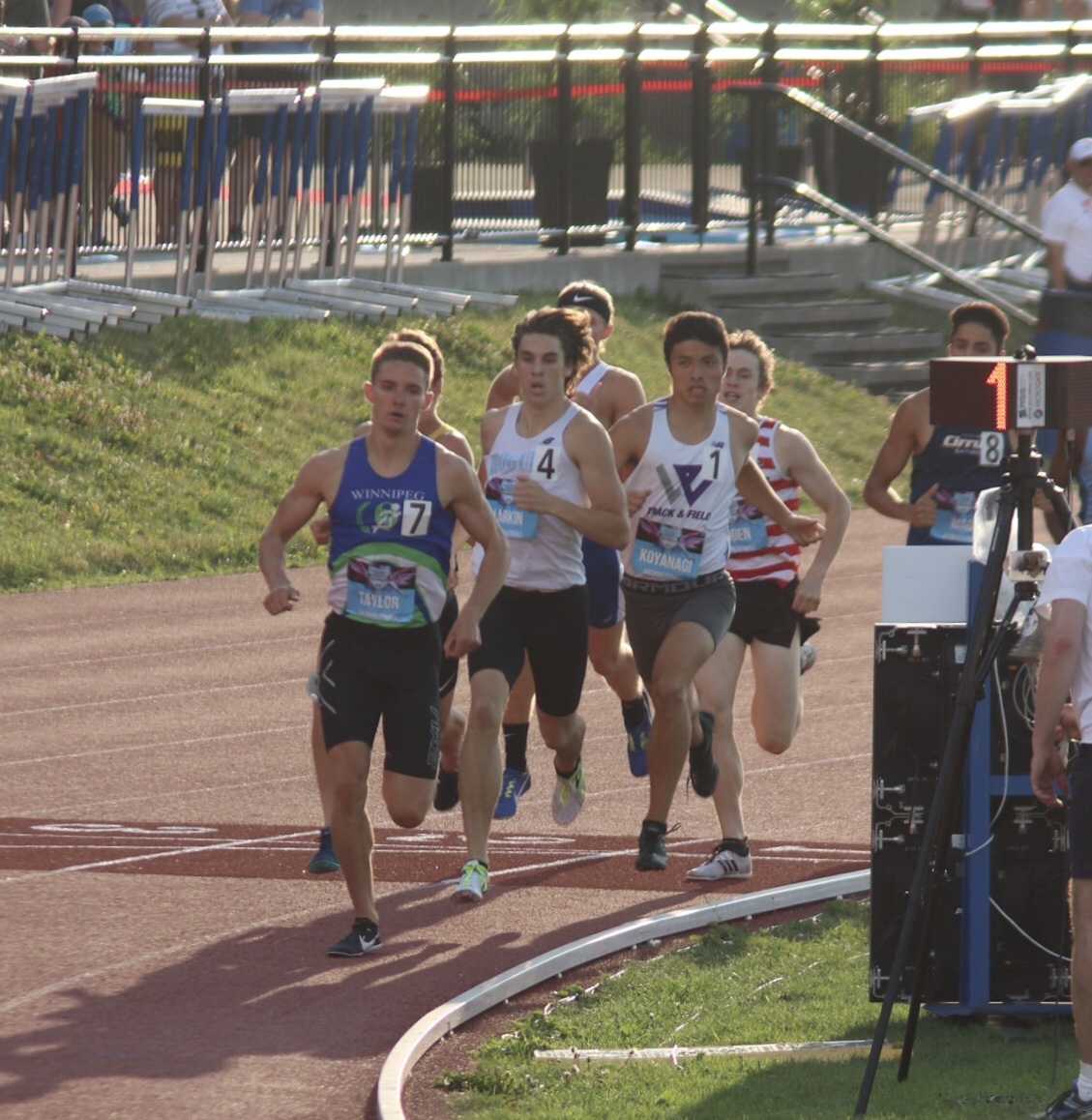 At the SATT Classic on June 1, 2019, Noah Hoffman had a personal best in his fifth 400m run in the past two years. It was a stellar 48.86 and places him among the top 400m runners in the province ( AND 13th U23 in Canada). At the same meet, Jack Taylor (foreground) ran a MSPB (Manitoba Soil Personal Best) in the 800m of 1:54.93 (10th in U20 in the Canada). This goes with his time of 3:59.71 in the 1500m from the AM Spring Open (also 10th U20 in Canada). [All rankings as of 12:37pm June 3, 2019]